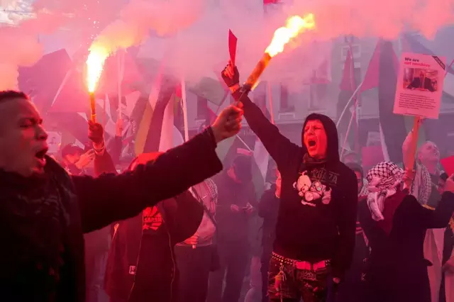 Spikersuppa Meydanı’ndan maçın oynanacağı Ullevaal Stadı’na hareket eden protestocular, “Filistin’e özgürlük”, “İsrail’i boykot et” sloganları atarken, Filistin bayrakları ve “İsrail’e kırmızı kart göster”, “Filistin’e özgürlük” “Soykırımcı İsrail” yazılı pankartlar taşıdı.