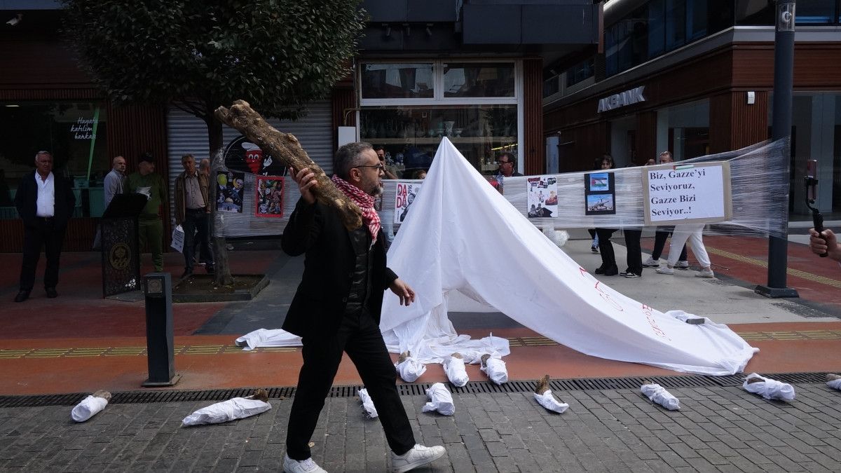 Bir çadır kurarak temsili kefene sardığı odun parçalarını yere dizen Sağlam, “Odunlar uyanın; Gazze’de bebekler ölüyor, insanlık ölüyor” diyerek slogan attı.